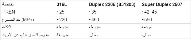 تُظهر هذه القيم أن Duplex 2205 يقدم ضعف قوة الخضوع مقارنة بـ 316L، مما يسمح بتصاميم أخف وبتكلفة أقل دون المساس بالمتانة أو الأمان.