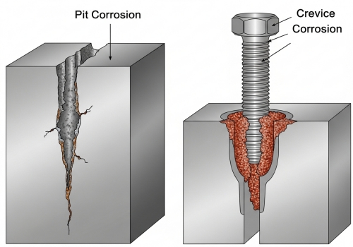 من السهل اكتشاف الصدأ الموحد أثناء الفحص، ولكن ماذا عن الثقوب الصغيرة التي لا يمكنك رؤيتها؟ تسبب هذه الفخاخ الخفية تسربات مفاجئة ويمكن أن توقف مشروع بناء بأكمله دون سابق إنذار. تعتبر الهجمات الموضعية مثل التنقر وتآكل الشقوق خطيرة لأنه يصعب اكتشافها. يحدث التنقر ثقوبًا صغيرة بسبب الكلوريدات، بينما يحدث تآكل الشقوق في الفجوات الضيقة. يحدث التآكل الجلفاني عندما يتلامس معدنان مختلفان في وجود الرطوبة. على عكس التآكل العام، لا يمكنك التنبؤ بموعد فشل الأنبوب بسبب التآكل الموضعي. هذا كابوس للمهندسين والمشترين. التنقر (Pitting) هو أحد أكثر الأشكال تدميرًا. يبدو وكأنه وخز إبرة على السطح، ولكن تحته، يخلق تجويفًا عميقًا. يحدث هذا عادة عندما تحتوي البيئة على الكثير من الكلوريدات، مثل مياه البحر أو الهواء المالح. نظرًا لأنني أعمل مع العديد من العملاء في البناء الساحلي والحفر البحري، فإنني أوصي دائمًا بدرجة 316 أو الفولاذ المزدوج (Duplex) لهذه المناطق. تحتوي هذه الدرجات على الموليبدينوم، الذي يحارب التنقر بشكل خاص. تآكل الشقوق (Crevice Corrosion) هو مشكلة في التصميم. يحدث في المساحات الضيقة حيث لا يتحرك السائل، مثل تحت حشية (Gasket)، أو رأس مسمار، أو تحت رواسب ضخمة من الأوساخ. في هذه الفجوات، ينفد الأكسجين. تذكر أن الفولاذ المقاوم للصدأ يحتاج إلى الأكسجين لإصلاح طبقته الواقية. بدون الأكسجين، تتحلل الطبقة، ويتآكل المعدن. التصميم الجيد والتنظيف المنتظم يمنع ذلك. التآكل الجلفاني (Galvanic Corrosion) (أو التآكل ثنائي المعدن) هو خطأ أراه في الأنظمة المختلطة. إذا قمت بتوصيل أنبوب من الصلب الكربوني مباشرة بأنبوب من الفولاذ المقاوم للصدأ، وكان هناك ماء، فإن الصلب الكربوني سيصدأ بشكل أسرع بكثير. يعمل الفولاذ المقاوم للصدأ ككاثود و"يأكل" الصلب الكربوني. يجب عليك استخدام مجموعات عازلة أو حشيات لفصل المعادن المختلفة. إليك جدول بسيط لمساعدتك في تحديد المخاطر: